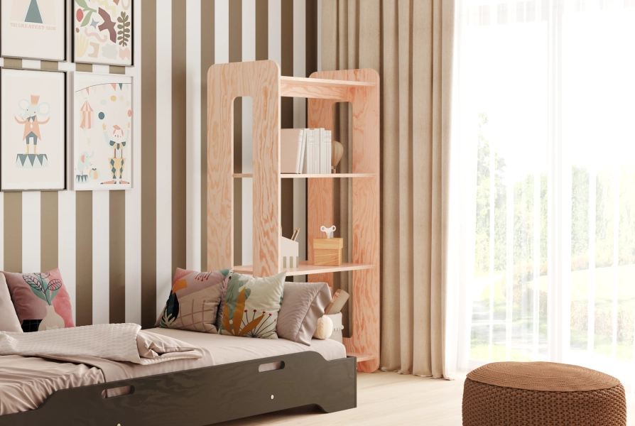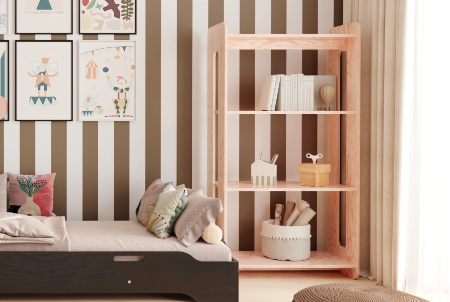 Das Regal garantiert nicht nur Solidität und Langlebigkeit, sondern schafft auch sichere Entwicklungsbedingungen im Kinderzimmer für viele Jahre. Verleihen Sie dem Raum Ihres Kindes Charme und Sicherheit.