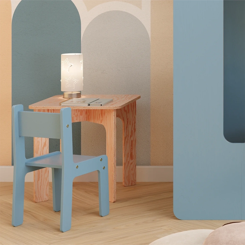 Der Holzstuhl ist aus ökologischem Kiefernsperrholz gefertigt. Dieses natürliche Material ist eine sichere und gesunde Wahl für die Umgebung des Kindes. Kiefernsperrholz ist frei von schädlichen Chemikalien und flüchtigen organischen Verbindungen, wodurch es für sauberere Raumluft sorgt und das Risiko von Allergenen für das Kind verringert. Die dauerhafte, robuste Konstruktion bietet einen eigenen, sicheren und stabilen Sitzplatz für das Kind, und ihre helle Farbe und natürliche Maserung verleihen dem Kinderzimmer eine warme und charmante Note.